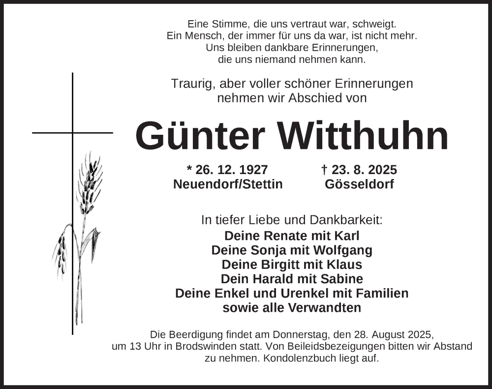Hier finden Sie alle Traueranzeigen aus der Zeitung, die bisher für Günter Witthuhn erschienen sind. Weitere Traueranzeigen, die in der Zeitung erscheinen, werden hier ebenfalls aufgelistet