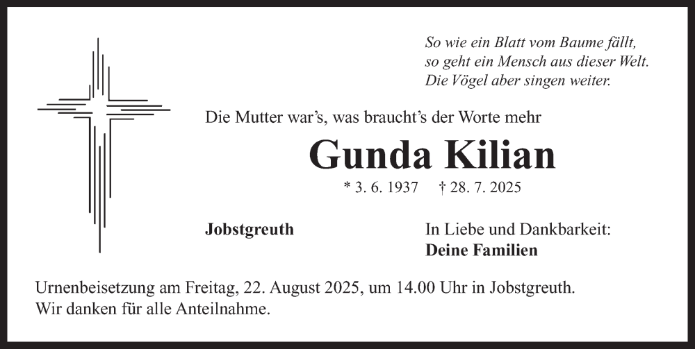 Hier finden Sie alle Traueranzeigen aus der Zeitung, die bisher für Gunda Kilian erschienen sind. Weitere Traueranzeigen, die in der Zeitung erscheinen, werden hier ebenfalls aufgelistet