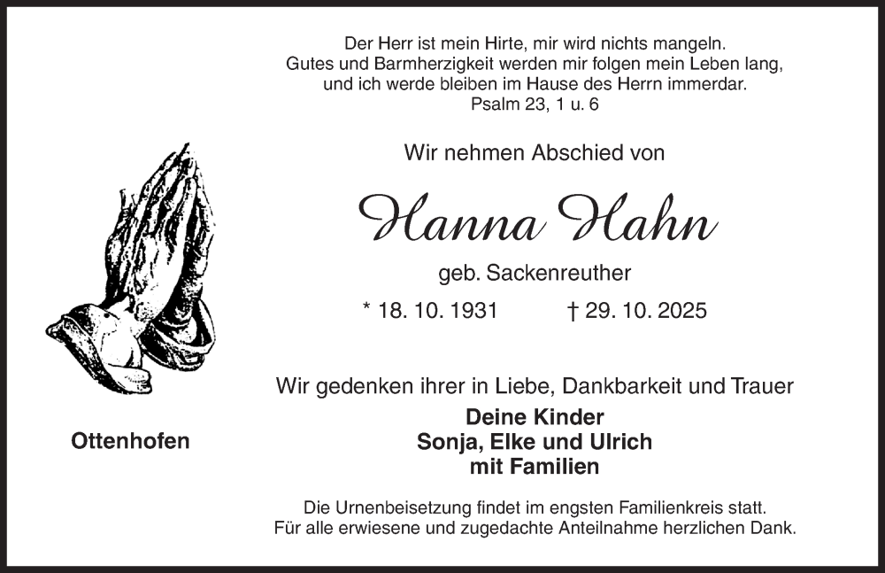 Hier finden Sie alle Traueranzeigen aus der Zeitung, die bisher für Hanna Hahn erschienen sind. Weitere Traueranzeigen, die in der Zeitung erscheinen, werden hier ebenfalls aufgelistet