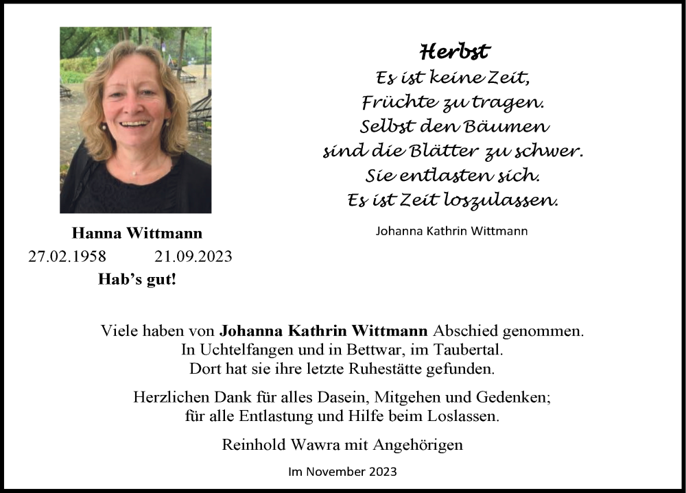 Hier finden Sie alle Traueranzeigen aus der Zeitung, die bisher für Hanna Wittmann erschienen sind. Weitere Traueranzeigen, die in der Zeitung erscheinen, werden hier ebenfalls aufgelistet