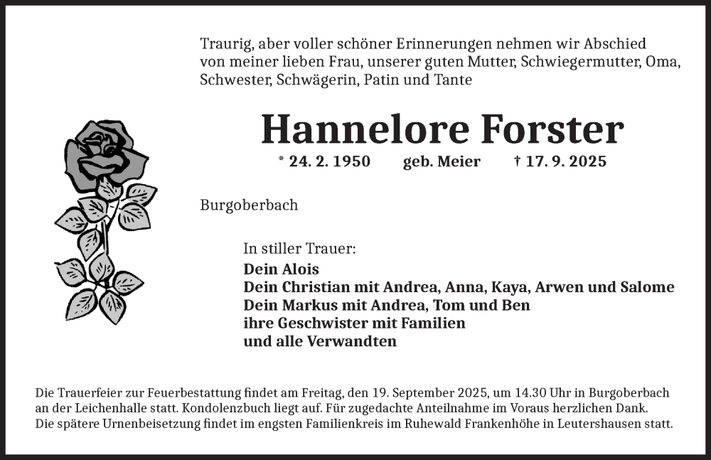 Hier finden Sie alle Traueranzeigen aus der Zeitung, die bisher für Hannelore Forster erschienen sind. Weitere Traueranzeigen, die in der Zeitung erscheinen, werden hier ebenfalls aufgelistet