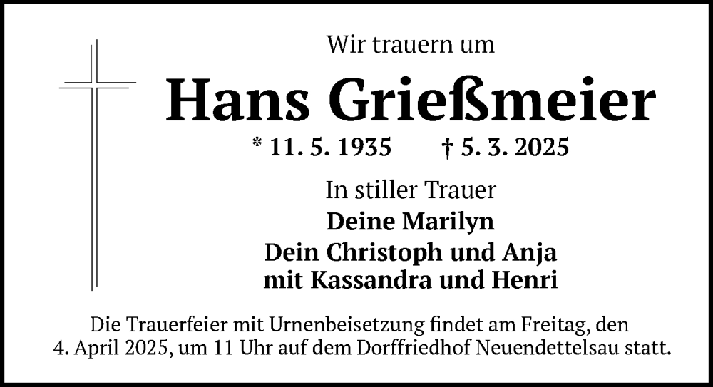 Hier finden Sie alle Traueranzeigen aus der Zeitung, die bisher für Hans Grießmeier erschienen sind. Weitere Traueranzeigen, die in der Zeitung erscheinen, werden hier ebenfalls aufgelistet