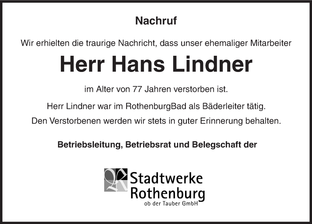 Hier finden Sie alle Traueranzeigen aus der Zeitung, die bisher für Hans Lindner erschienen sind. Weitere Traueranzeigen, die in der Zeitung erscheinen, werden hier ebenfalls aufgelistet