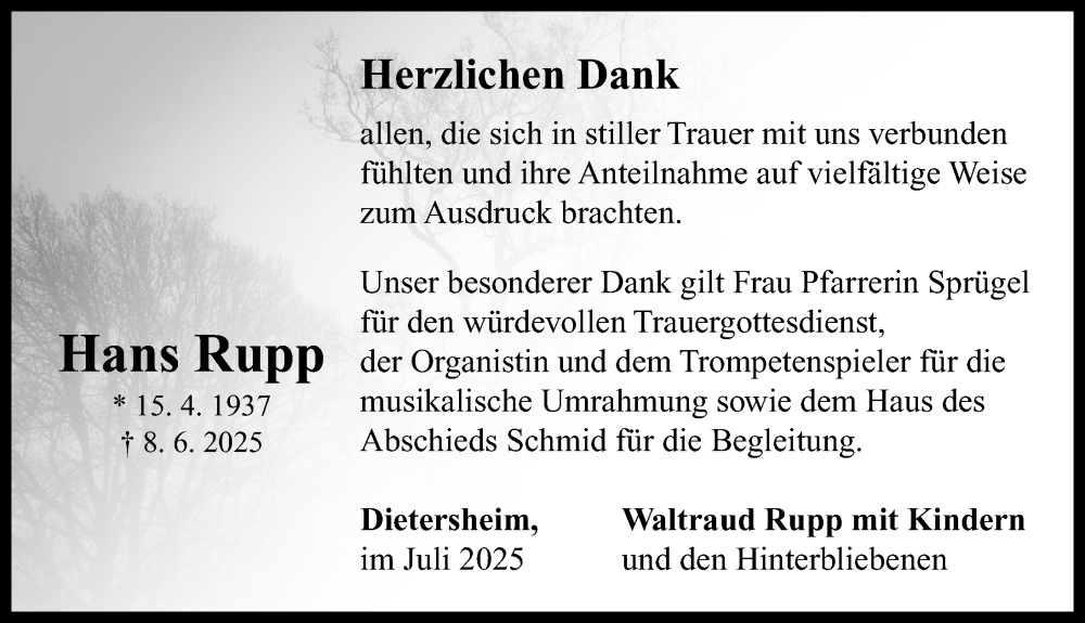 Hier finden Sie alle Traueranzeigen aus der Zeitung, die bisher für Hans Rupp erschienen sind. Weitere Traueranzeigen, die in der Zeitung erscheinen, werden hier ebenfalls aufgelistet