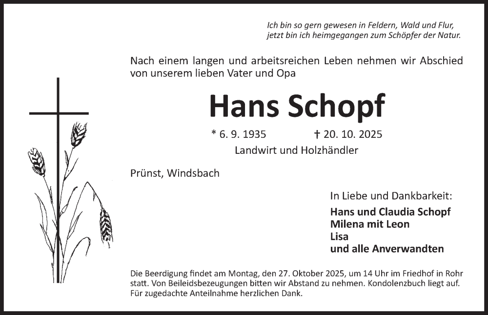 Hier finden Sie alle Traueranzeigen aus der Zeitung, die bisher für Hans Schopf erschienen sind. Weitere Traueranzeigen, die in der Zeitung erscheinen, werden hier ebenfalls aufgelistet