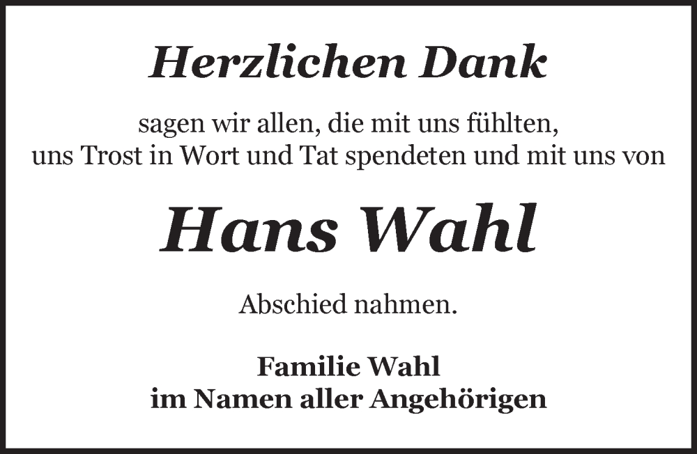 Hier finden Sie alle Traueranzeigen aus der Zeitung, die bisher für Hans Wahl erschienen sind. Weitere Traueranzeigen, die in der Zeitung erscheinen, werden hier ebenfalls aufgelistet