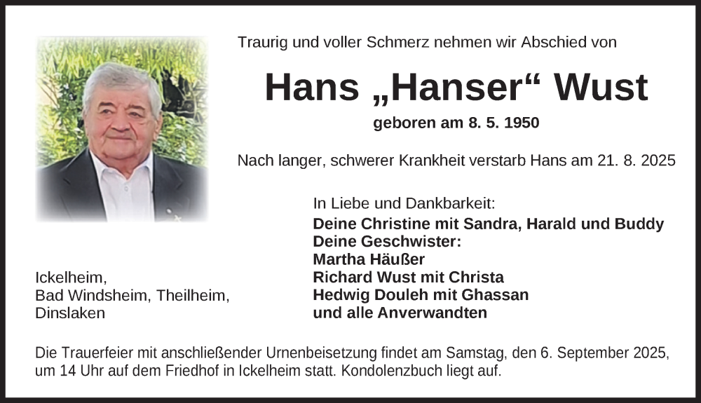 Hier finden Sie alle Traueranzeigen aus der Zeitung, die bisher für Hans Wust erschienen sind. Weitere Traueranzeigen, die in der Zeitung erscheinen, werden hier ebenfalls aufgelistet