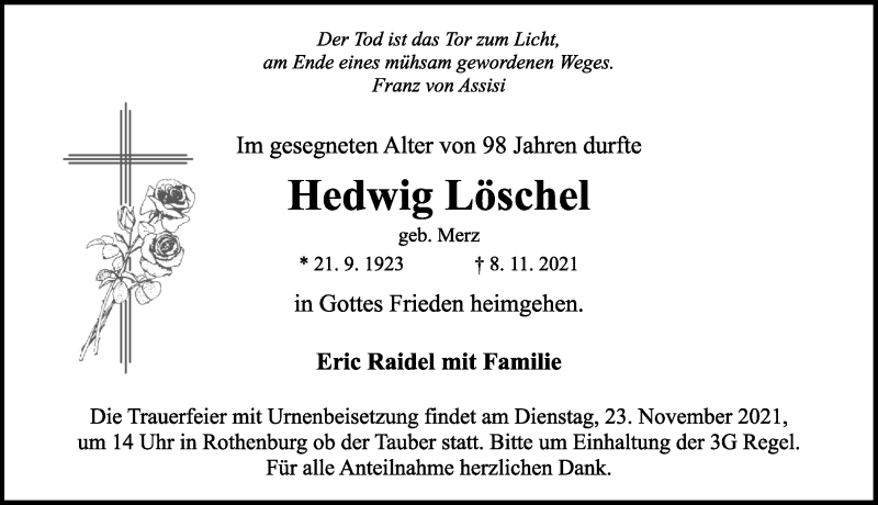 Hier finden Sie alle Traueranzeigen aus der Zeitung, die bisher für Hedwig Löschel erschienen sind. Weitere Traueranzeigen, die in der Zeitung erscheinen, werden hier ebenfalls aufgelistet
