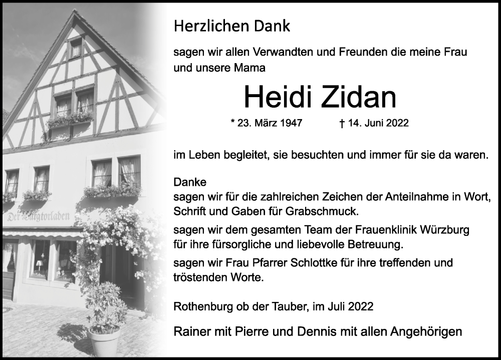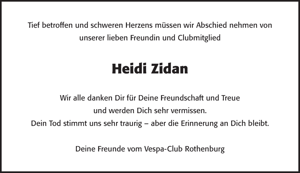 Hier finden Sie alle Traueranzeigen aus der Zeitung, die bisher für Heidi Zidan erschienen sind. Weitere Traueranzeigen, die in der Zeitung erscheinen, werden hier ebenfalls aufgelistet