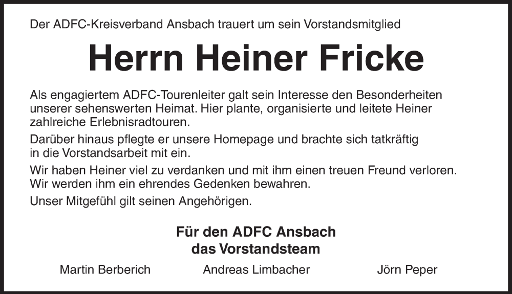 Hier finden Sie alle Traueranzeigen aus der Zeitung, die bisher für Heiner Fricke erschienen sind. Weitere Traueranzeigen, die in der Zeitung erscheinen, werden hier ebenfalls aufgelistet