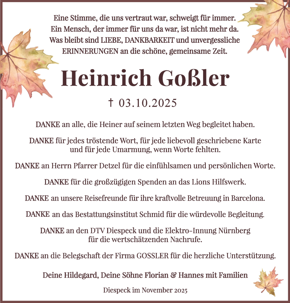 Hier finden Sie alle Traueranzeigen aus der Zeitung, die bisher für Heinrich Goßler erschienen sind. Weitere Traueranzeigen, die in der Zeitung erscheinen, werden hier ebenfalls aufgelistet