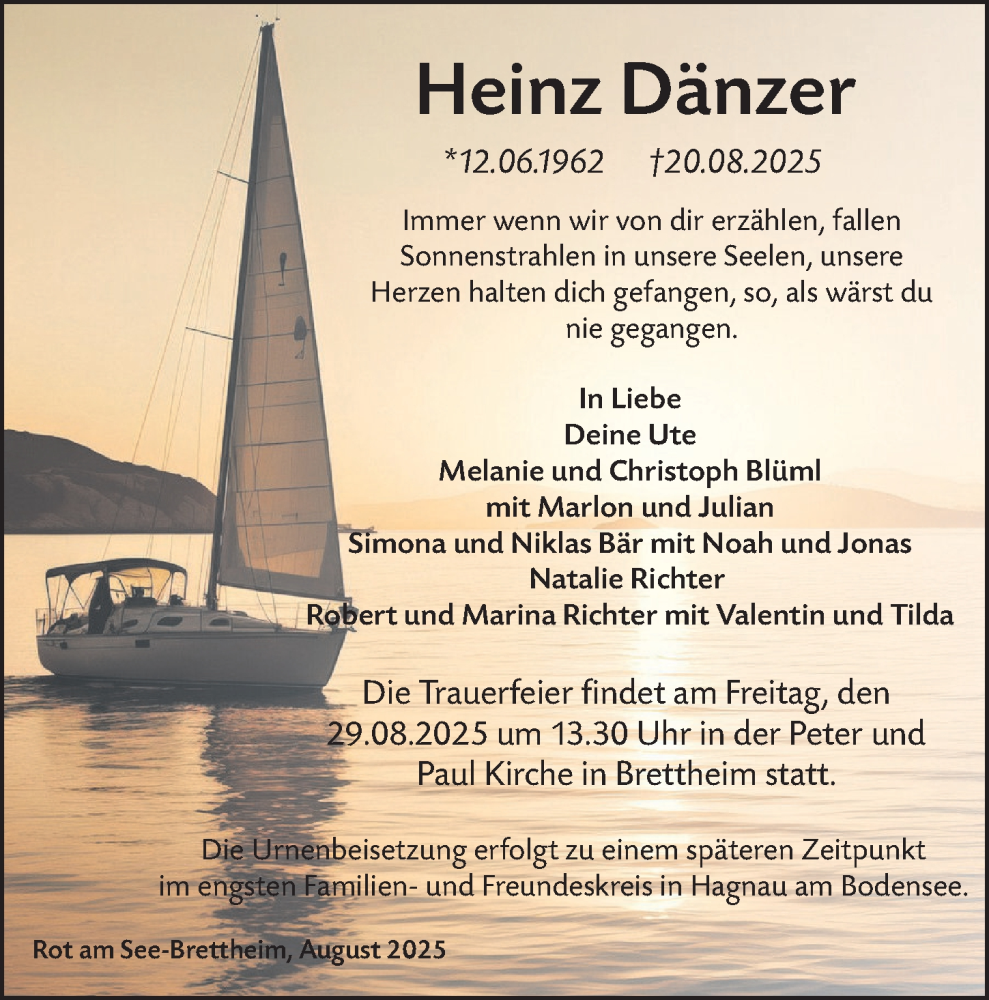 Hier finden Sie alle Traueranzeigen aus der Zeitung, die bisher für Heinz Dänzer erschienen sind. Weitere Traueranzeigen, die in der Zeitung erscheinen, werden hier ebenfalls aufgelistet
