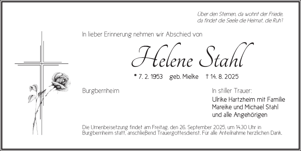 Hier finden Sie alle Traueranzeigen aus der Zeitung, die bisher für Helene Stahl erschienen sind. Weitere Traueranzeigen, die in der Zeitung erscheinen, werden hier ebenfalls aufgelistet