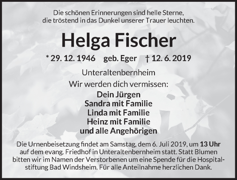 Hier finden Sie alle Traueranzeigen aus der Zeitung, die bisher für Helga Fischer erschienen sind. Weitere Traueranzeigen, die in der Zeitung erscheinen, werden hier ebenfalls aufgelistet