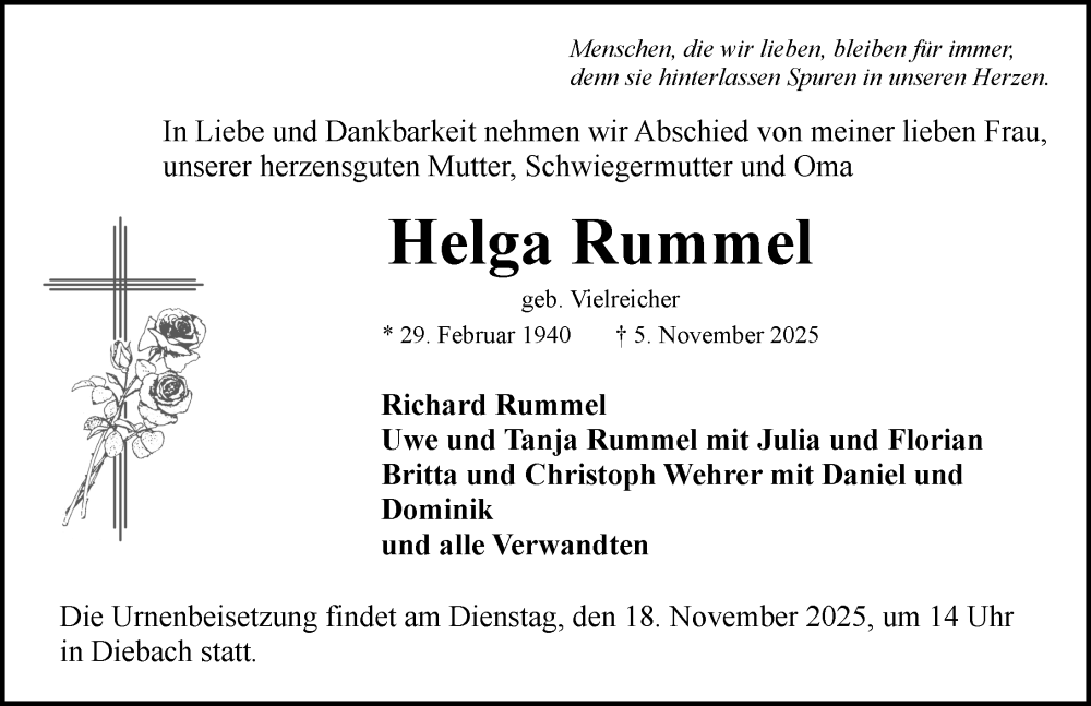 Hier finden Sie alle Traueranzeigen aus der Zeitung, die bisher für Helga Rummel erschienen sind. Weitere Traueranzeigen, die in der Zeitung erscheinen, werden hier ebenfalls aufgelistet