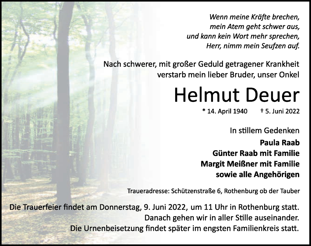Hier finden Sie alle Traueranzeigen aus der Zeitung, die bisher für Helmut Deuer erschienen sind. Weitere Traueranzeigen, die in der Zeitung erscheinen, werden hier ebenfalls aufgelistet