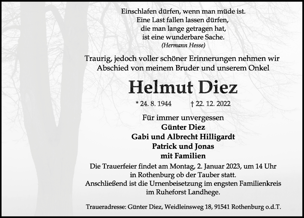 Hier finden Sie alle Traueranzeigen aus der Zeitung, die bisher für Helmut Diez erschienen sind. Weitere Traueranzeigen, die in der Zeitung erscheinen, werden hier ebenfalls aufgelistet