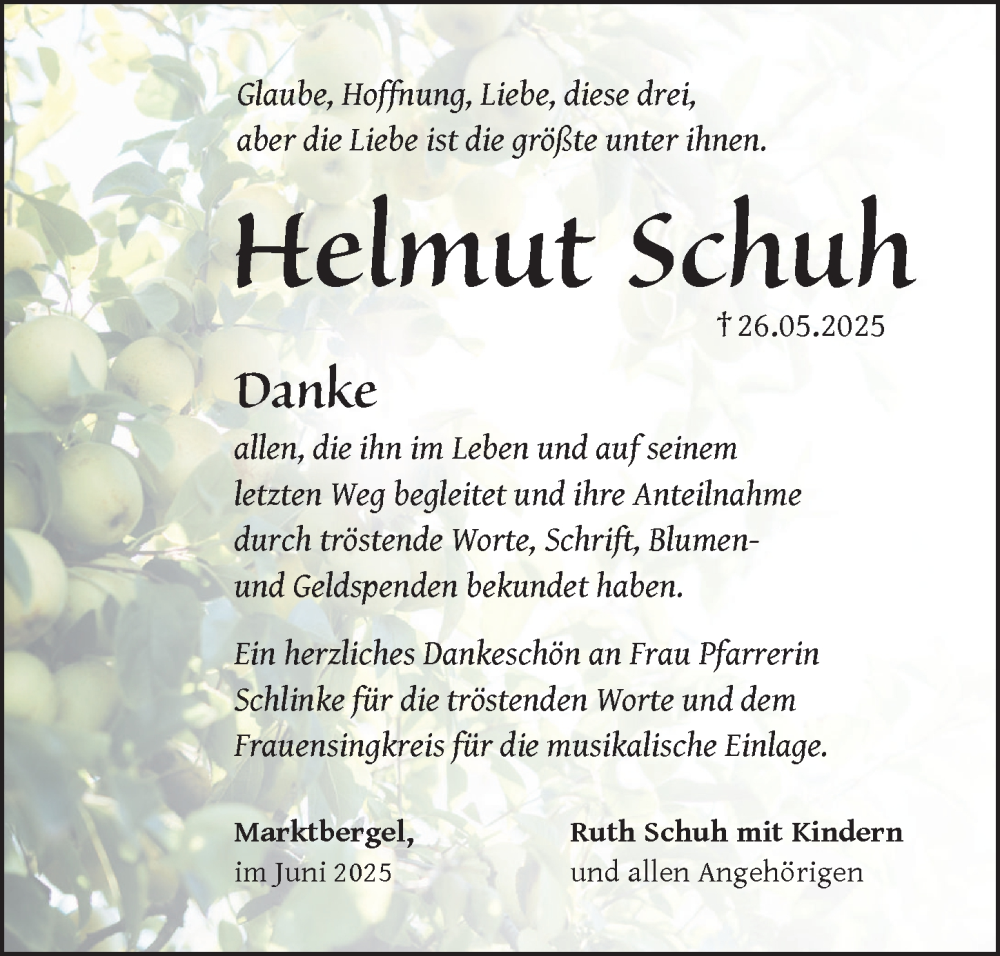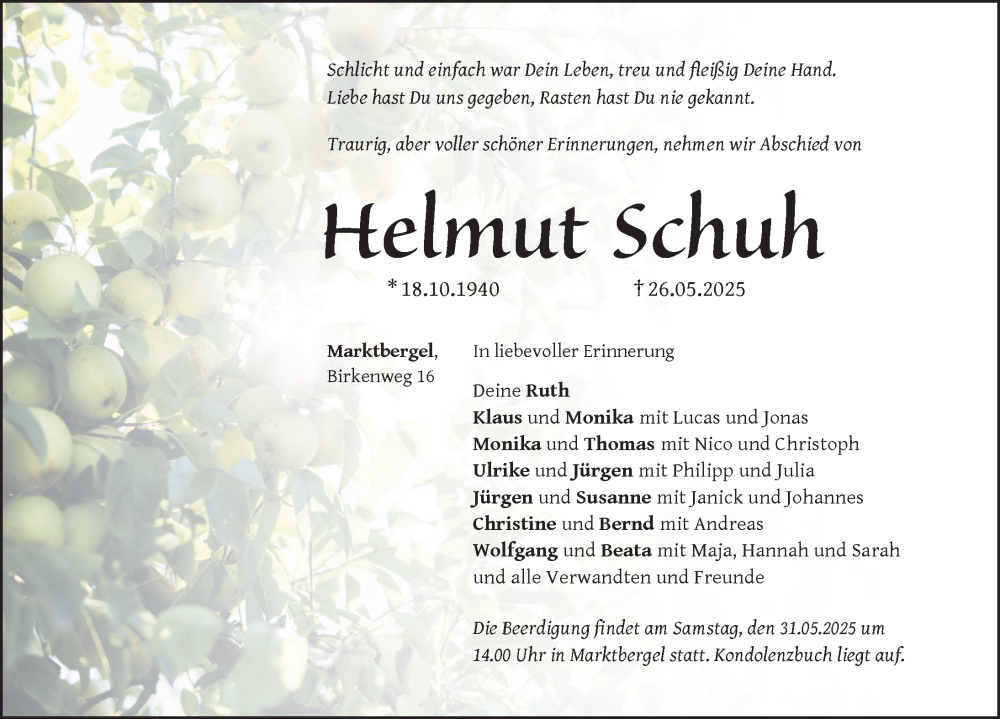 Hier finden Sie alle Traueranzeigen aus der Zeitung, die bisher für Helmut Schuh erschienen sind. Weitere Traueranzeigen, die in der Zeitung erscheinen, werden hier ebenfalls aufgelistet