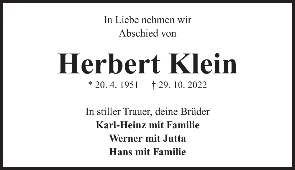 Hier finden Sie alle Traueranzeigen aus der Zeitung, die bisher für Herbert Klein erschienen sind. Weitere Traueranzeigen, die in der Zeitung erscheinen, werden hier ebenfalls aufgelistet