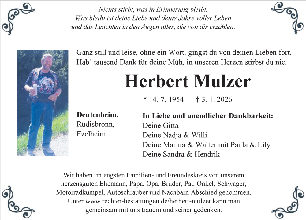 Hier finden Sie alle Traueranzeigen aus der Zeitung, die bisher für Herbert Mulzer erschienen sind. Weitere Traueranzeigen, die in der Zeitung erscheinen, werden hier ebenfalls aufgelistet