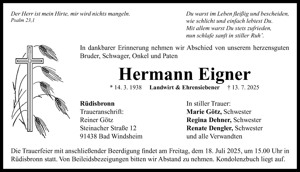 Hier finden Sie alle Traueranzeigen aus der Zeitung, die bisher für Hermann Eigner erschienen sind. Weitere Traueranzeigen, die in der Zeitung erscheinen, werden hier ebenfalls aufgelistet