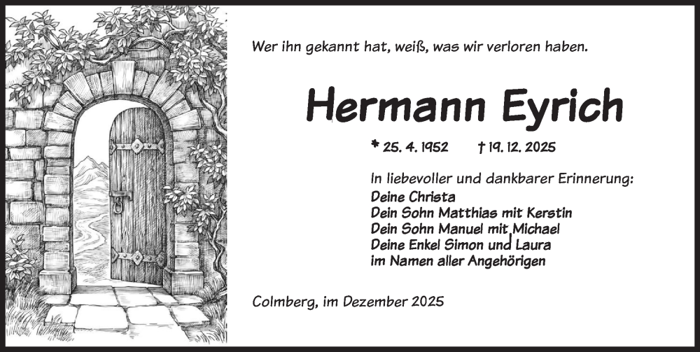 Hier finden Sie alle Traueranzeigen aus der Zeitung, die bisher für Hermann Eyrich erschienen sind. Weitere Traueranzeigen, die in der Zeitung erscheinen, werden hier ebenfalls aufgelistet