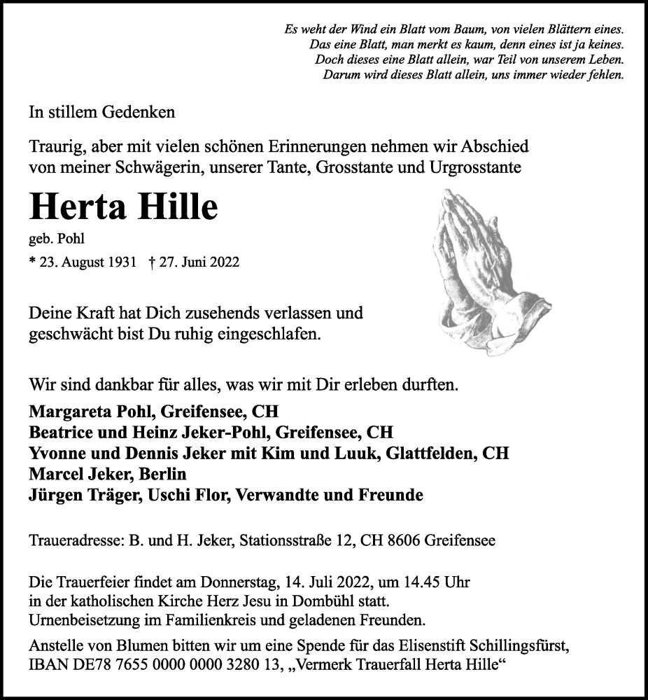 Hier finden Sie alle Traueranzeigen aus der Zeitung, die bisher für Herta Hille erschienen sind. Weitere Traueranzeigen, die in der Zeitung erscheinen, werden hier ebenfalls aufgelistet