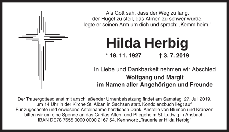 Hier finden Sie alle Traueranzeigen aus der Zeitung, die bisher für Hilda Herbig erschienen sind. Weitere Traueranzeigen, die in der Zeitung erscheinen, werden hier ebenfalls aufgelistet