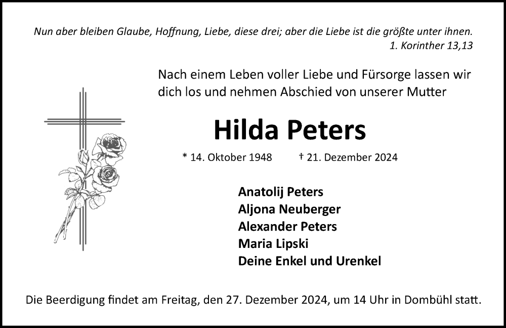 Hier finden Sie alle Traueranzeigen aus der Zeitung, die bisher für Hilda Peters erschienen sind. Weitere Traueranzeigen, die in der Zeitung erscheinen, werden hier ebenfalls aufgelistet