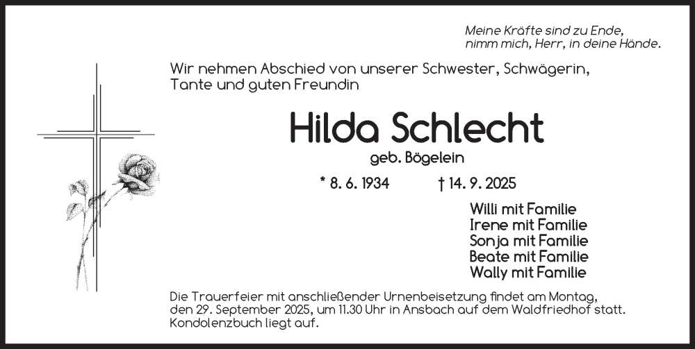 Hier finden Sie alle Traueranzeigen aus der Zeitung, die bisher für Hilda Schlecht erschienen sind. Weitere Traueranzeigen, die in der Zeitung erscheinen, werden hier ebenfalls aufgelistet
