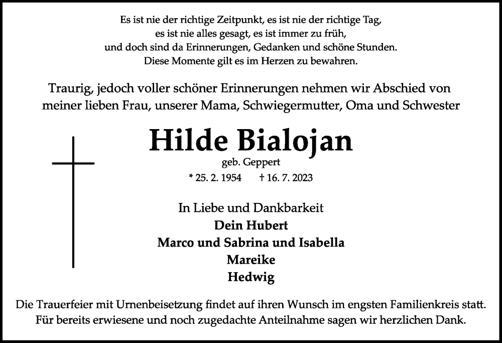 Hier finden Sie alle Traueranzeigen aus der Zeitung, die bisher für Hilde Bialojan erschienen sind. Weitere Traueranzeigen, die in der Zeitung erscheinen, werden hier ebenfalls aufgelistet