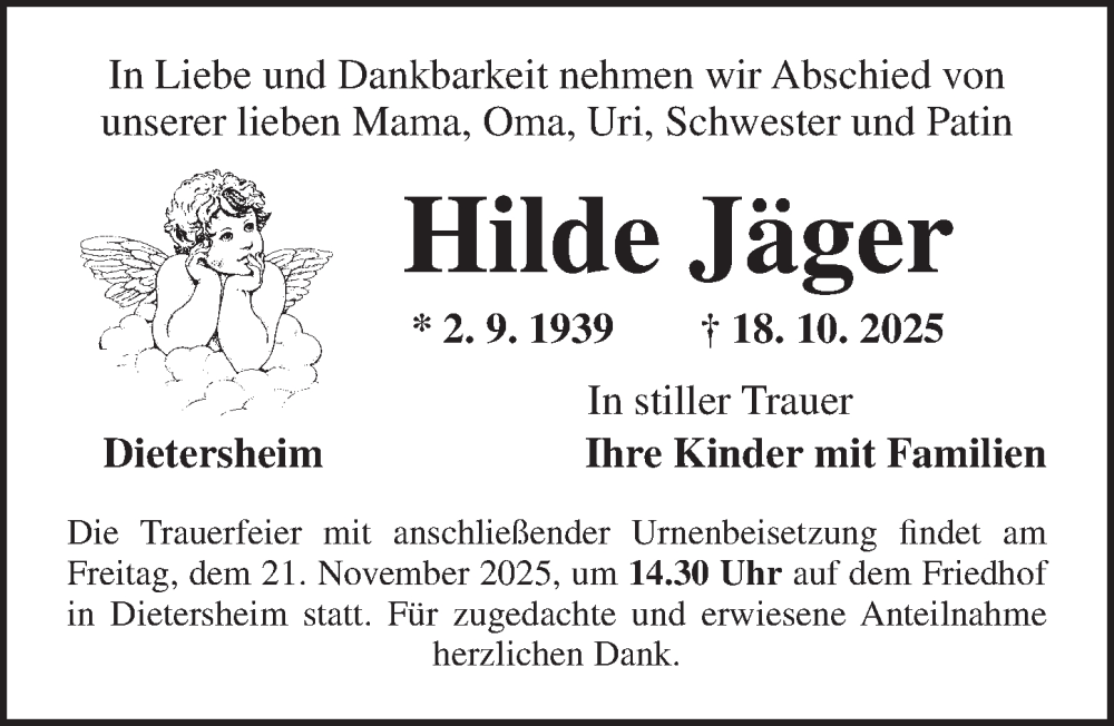 Hier finden Sie alle Traueranzeigen aus der Zeitung, die bisher für Hilde Jäger erschienen sind. Weitere Traueranzeigen, die in der Zeitung erscheinen, werden hier ebenfalls aufgelistet