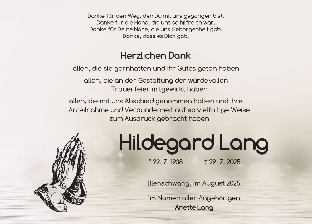 Hier finden Sie alle Traueranzeigen aus der Zeitung, die bisher für Hildegard Lang erschienen sind. Weitere Traueranzeigen, die in der Zeitung erscheinen, werden hier ebenfalls aufgelistet