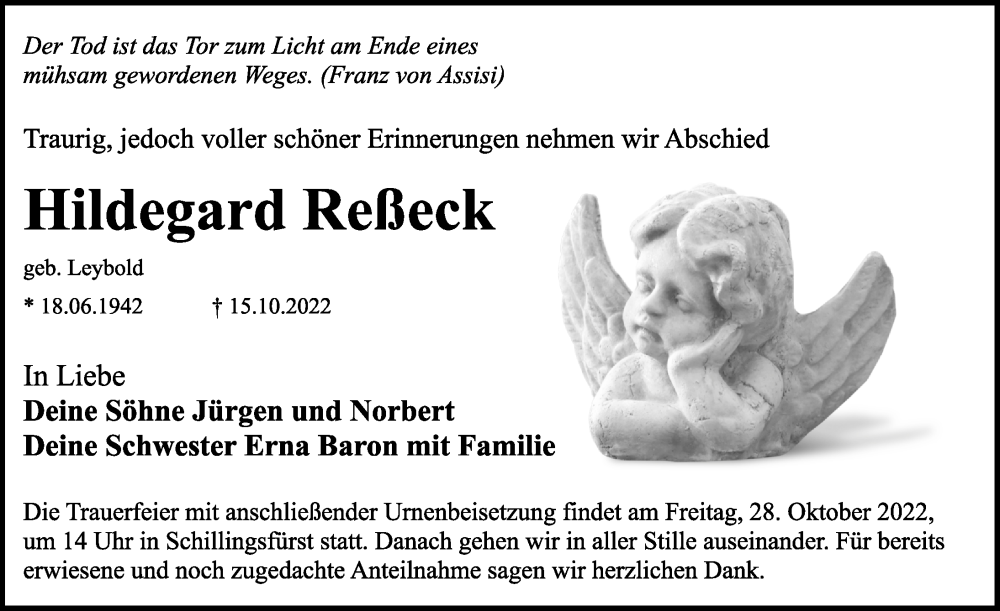 Hier finden Sie alle Traueranzeigen aus der Zeitung, die bisher für Hildegard Reßeck erschienen sind. Weitere Traueranzeigen, die in der Zeitung erscheinen, werden hier ebenfalls aufgelistet