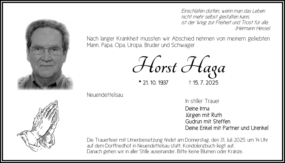 Hier finden Sie alle Traueranzeigen aus der Zeitung, die bisher für Horst Haga erschienen sind. Weitere Traueranzeigen, die in der Zeitung erscheinen, werden hier ebenfalls aufgelistet