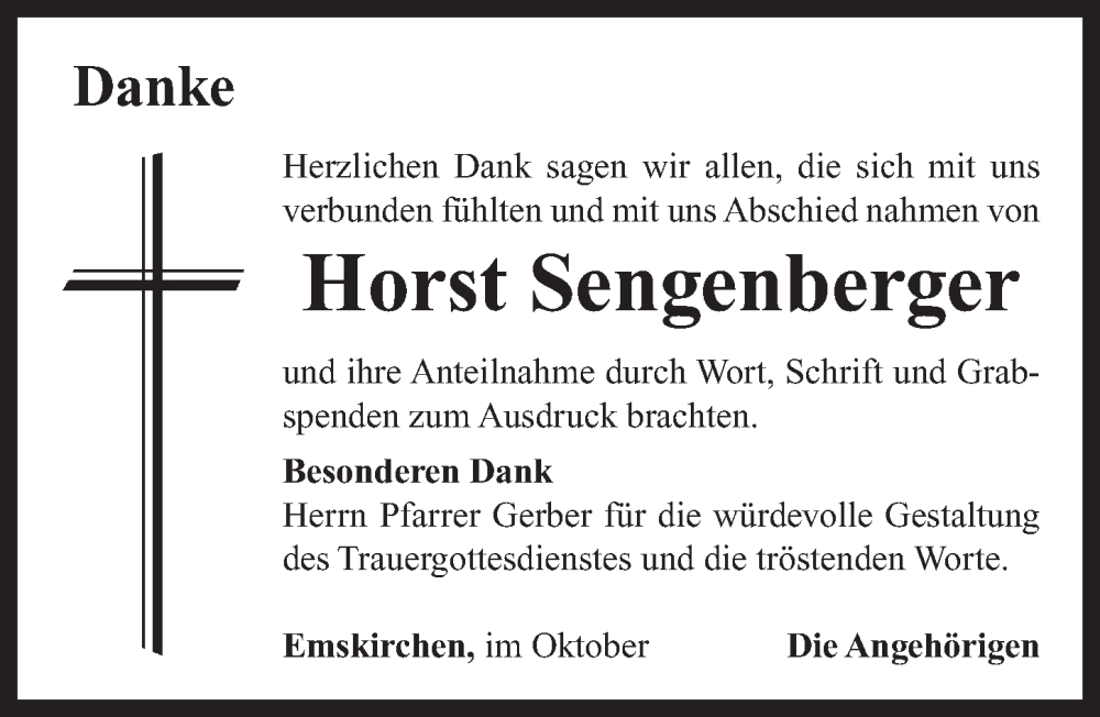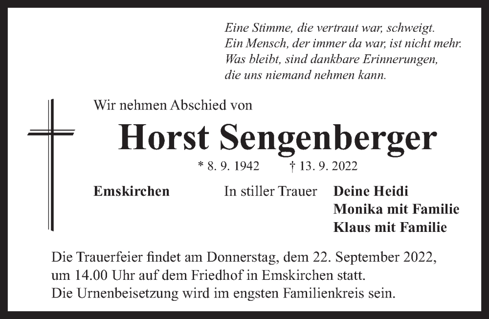 Hier finden Sie alle Traueranzeigen aus der Zeitung, die bisher für Horst Sengenberger erschienen sind. Weitere Traueranzeigen, die in der Zeitung erscheinen, werden hier ebenfalls aufgelistet