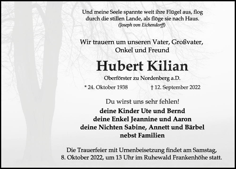 Hier finden Sie alle Traueranzeigen aus der Zeitung, die bisher für Hubert Kilian erschienen sind. Weitere Traueranzeigen, die in der Zeitung erscheinen, werden hier ebenfalls aufgelistet