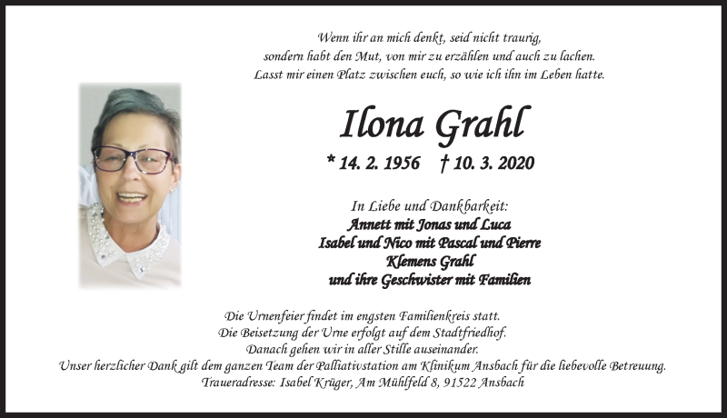 Hier finden Sie alle Traueranzeigen aus der Zeitung, die bisher für Ilona Grahl erschienen sind. Weitere Traueranzeigen, die in der Zeitung erscheinen, werden hier ebenfalls aufgelistet