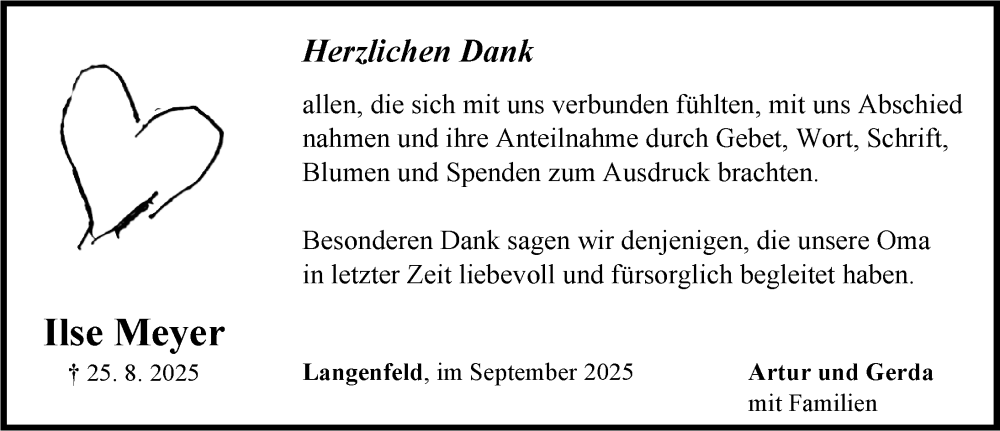 Hier finden Sie alle Traueranzeigen aus der Zeitung, die bisher für Ilse Meyer erschienen sind. Weitere Traueranzeigen, die in der Zeitung erscheinen, werden hier ebenfalls aufgelistet