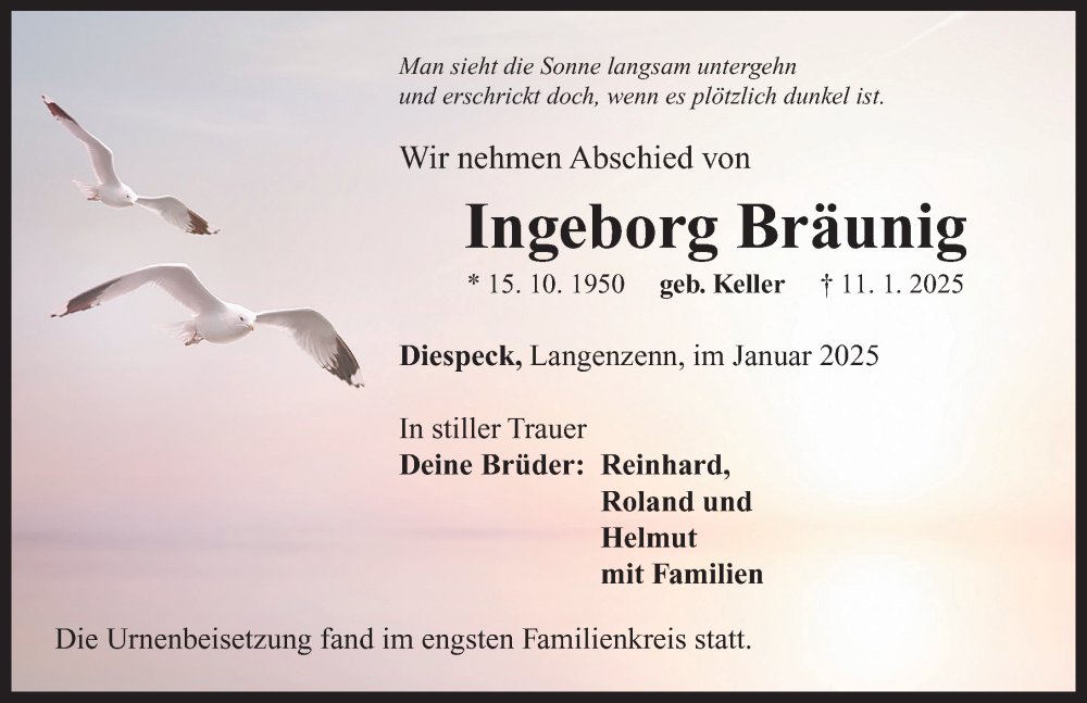 Hier finden Sie alle Traueranzeigen aus der Zeitung, die bisher für Ingeborg Bräunig erschienen sind. Weitere Traueranzeigen, die in der Zeitung erscheinen, werden hier ebenfalls aufgelistet