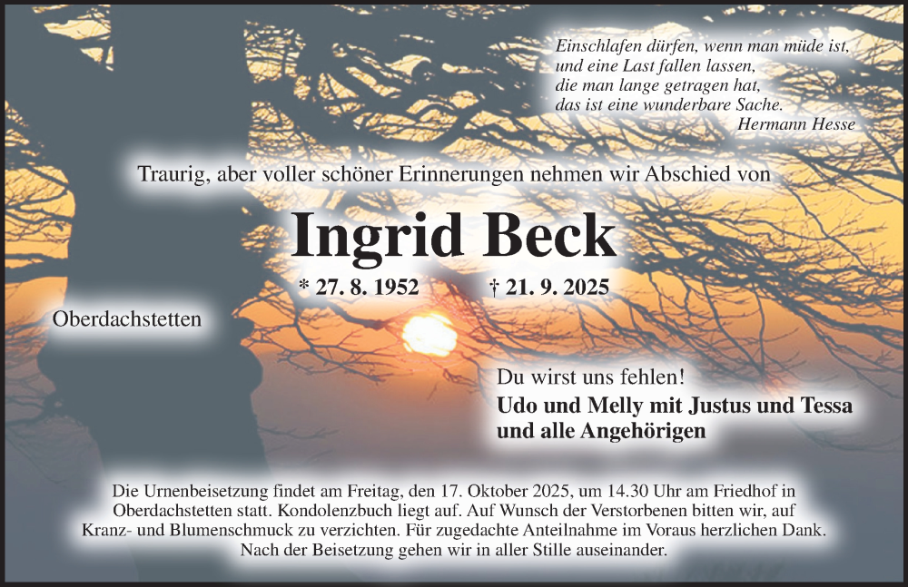 Hier finden Sie alle Traueranzeigen aus der Zeitung, die bisher für Ingrid Beck erschienen sind. Weitere Traueranzeigen, die in der Zeitung erscheinen, werden hier ebenfalls aufgelistet