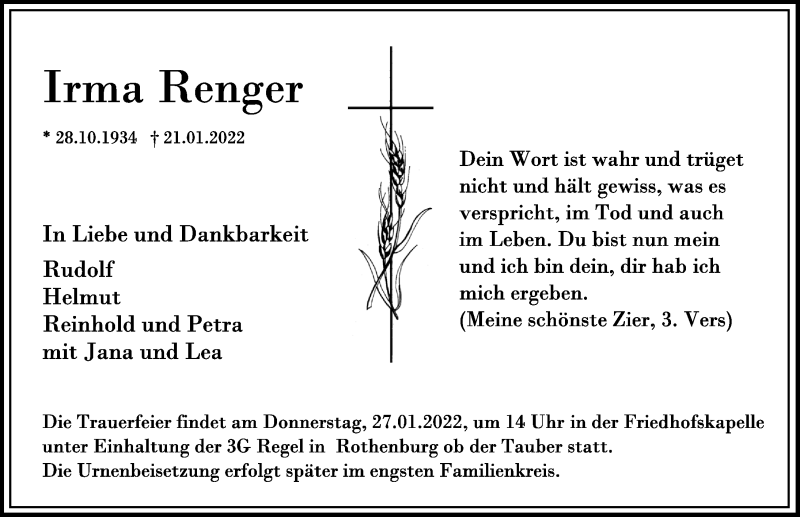 Hier finden Sie alle Traueranzeigen aus der Zeitung, die bisher für Irma Renger erschienen sind. Weitere Traueranzeigen, die in der Zeitung erscheinen, werden hier ebenfalls aufgelistet