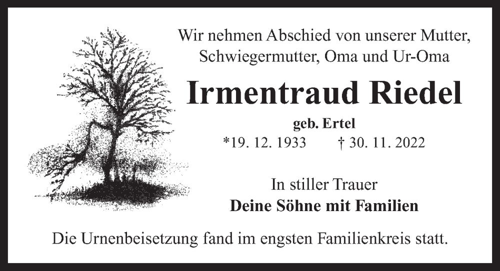 Hier finden Sie alle Traueranzeigen aus der Zeitung, die bisher für Irmentraud Riedel erschienen sind. Weitere Traueranzeigen, die in der Zeitung erscheinen, werden hier ebenfalls aufgelistet