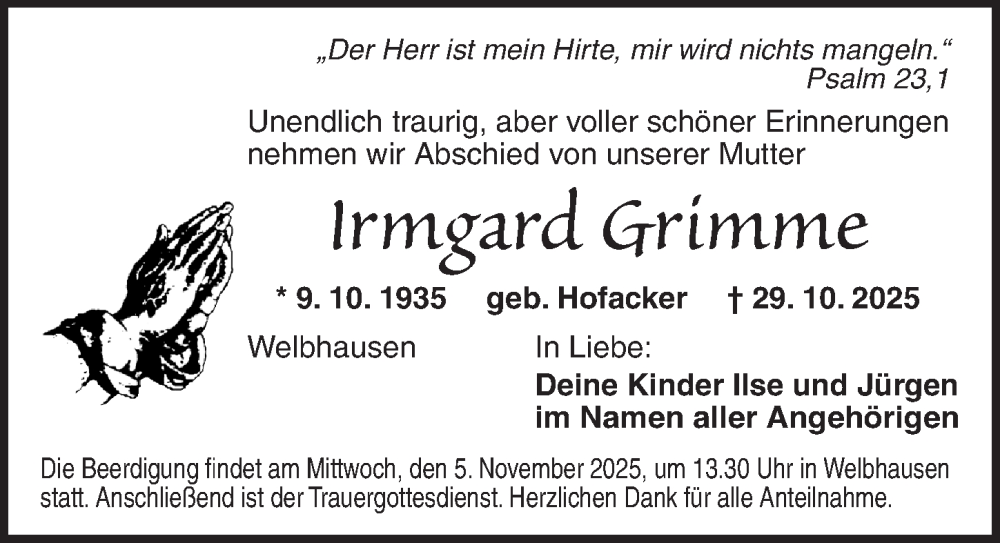 Hier finden Sie alle Traueranzeigen aus der Zeitung, die bisher für Irmgard Grimme erschienen sind. Weitere Traueranzeigen, die in der Zeitung erscheinen, werden hier ebenfalls aufgelistet