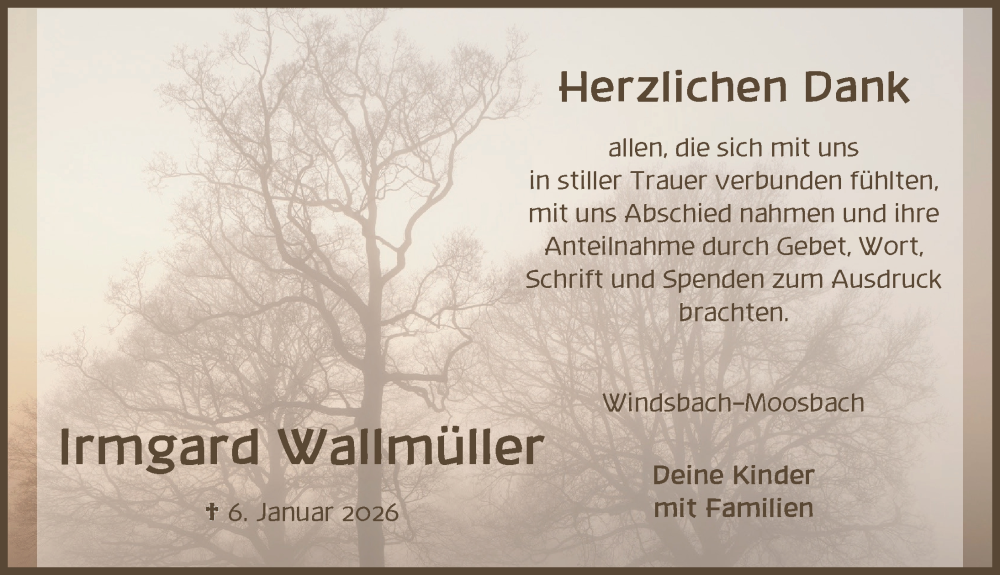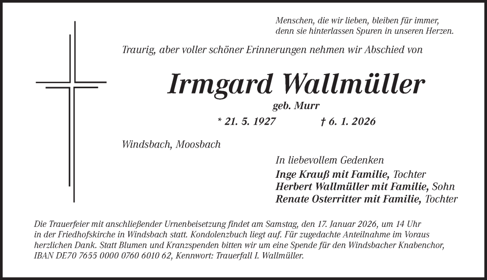 Hier finden Sie alle Traueranzeigen aus der Zeitung, die bisher für Irmgard Wallmüller erschienen sind. Weitere Traueranzeigen, die in der Zeitung erscheinen, werden hier ebenfalls aufgelistet