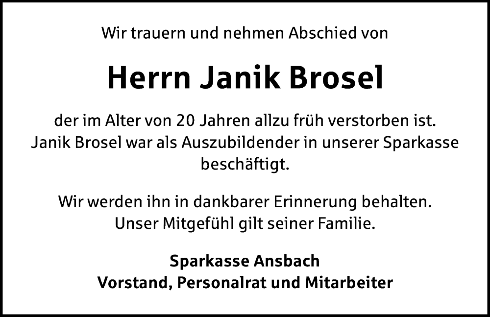 Hier finden Sie alle Traueranzeigen aus der Zeitung, die bisher für Janik Brosel erschienen sind. Weitere Traueranzeigen, die in der Zeitung erscheinen, werden hier ebenfalls aufgelistet
