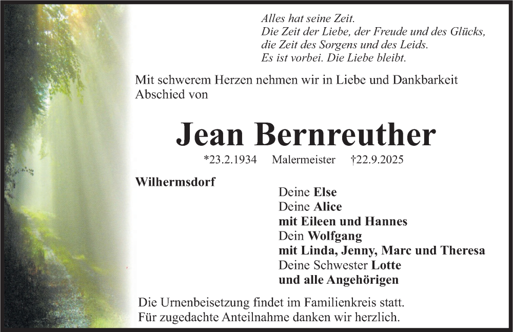 Hier finden Sie alle Traueranzeigen aus der Zeitung, die bisher für Jean Bernreuther erschienen sind. Weitere Traueranzeigen, die in der Zeitung erscheinen, werden hier ebenfalls aufgelistet