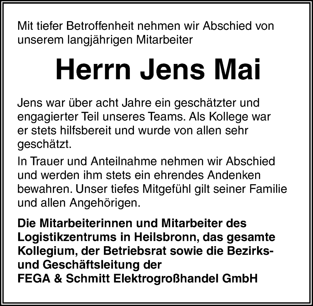 Hier finden Sie alle Traueranzeigen aus der Zeitung, die bisher für Jens Mai erschienen sind. Weitere Traueranzeigen, die in der Zeitung erscheinen, werden hier ebenfalls aufgelistet