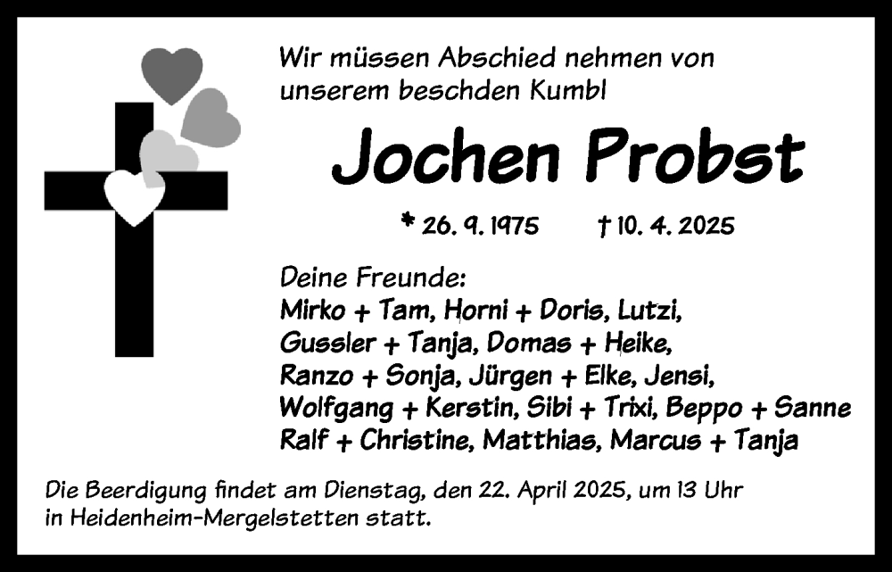 Hier finden Sie alle Traueranzeigen aus der Zeitung, die bisher für Jochen Probst erschienen sind. Weitere Traueranzeigen, die in der Zeitung erscheinen, werden hier ebenfalls aufgelistet