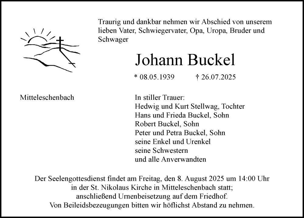 Hier finden Sie alle Traueranzeigen aus der Zeitung, die bisher für Johann Buckel erschienen sind. Weitere Traueranzeigen, die in der Zeitung erscheinen, werden hier ebenfalls aufgelistet